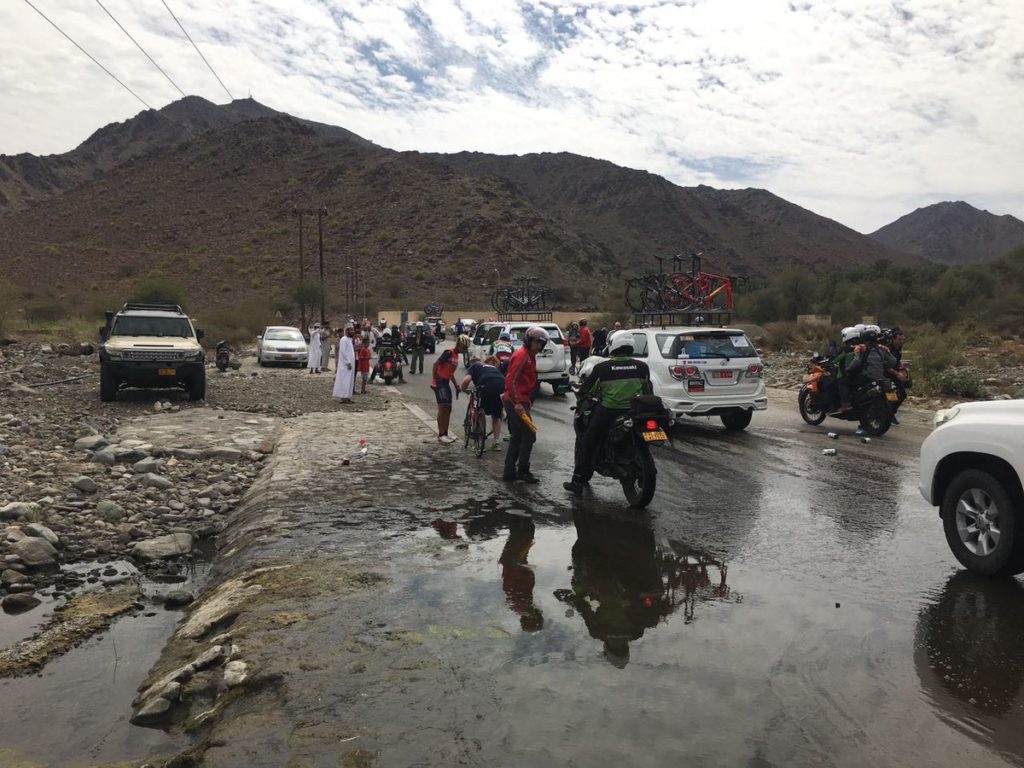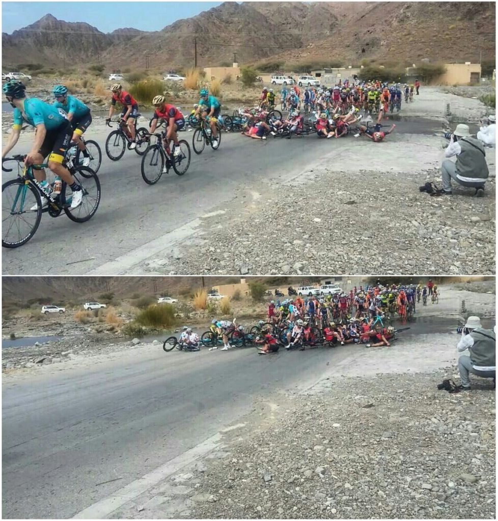 Esta rolando esta semana mais uma prova caça niqueis no oriente médio, a Volta de Omã passa por belíssimas paisagens e claro praticamente sem público, hoje na quinta etapa um trecho da pista estava tomada por água e não sinalizada, o resultado foi uma queda massiva: