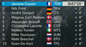 No subida da última montanha Politt atacou da fuga e um pouco depois teve Jerome Cousin consigo, passaram na meta de sprint a 9km do final com 50″ de vantagem para o pelote e 26″ para Edet. Nos quilômetros finais Politt discutiu com Cousin pela falta de cooperação mas o francês não colocava a cara no vento. Uma queda no meio do pelote assustou e a diminuição do rítmo na ponta pela queda talvez tenha sido o fator determinante para vitória da fuga.
