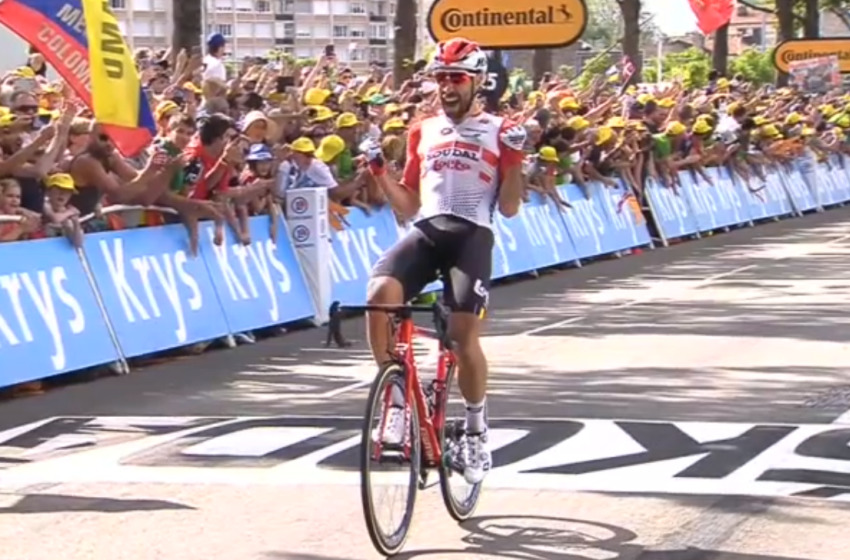 O homem fuga, o belga Thomas De Gendt venceu hoje no Tour de France. Na fuga desde os quilômetros iniciais da etapa, De Gendt ficou solo na última subida e mesmo sabendo que era só descida até Saint Ettiene ele precisou puxar muito. Alaphilippe e Tibaut Pinot atacaram do pelote e perseguiam De Gendt velozmente. Ao final Pinot ficou com o segundo lugar e Alaphilippe com o terceiro, com o resultado o francês recuperou a camisa amarela e largará no feriado nacional francês como líder do Tour de France.