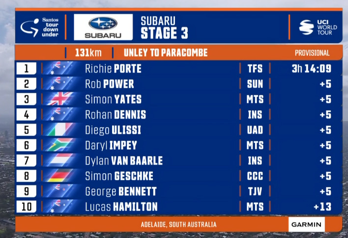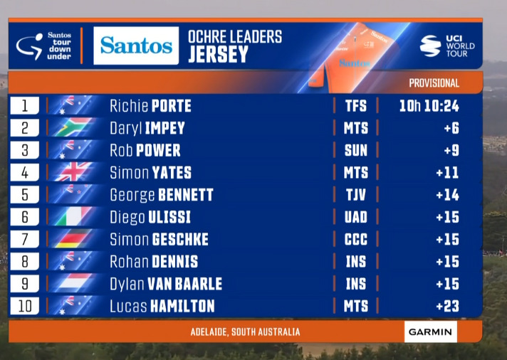 Com o resultado a briga pelo Tour Down Under mudou na classificação geral agora com Porte liderando com 6 segundos sobre Daryl Impey: