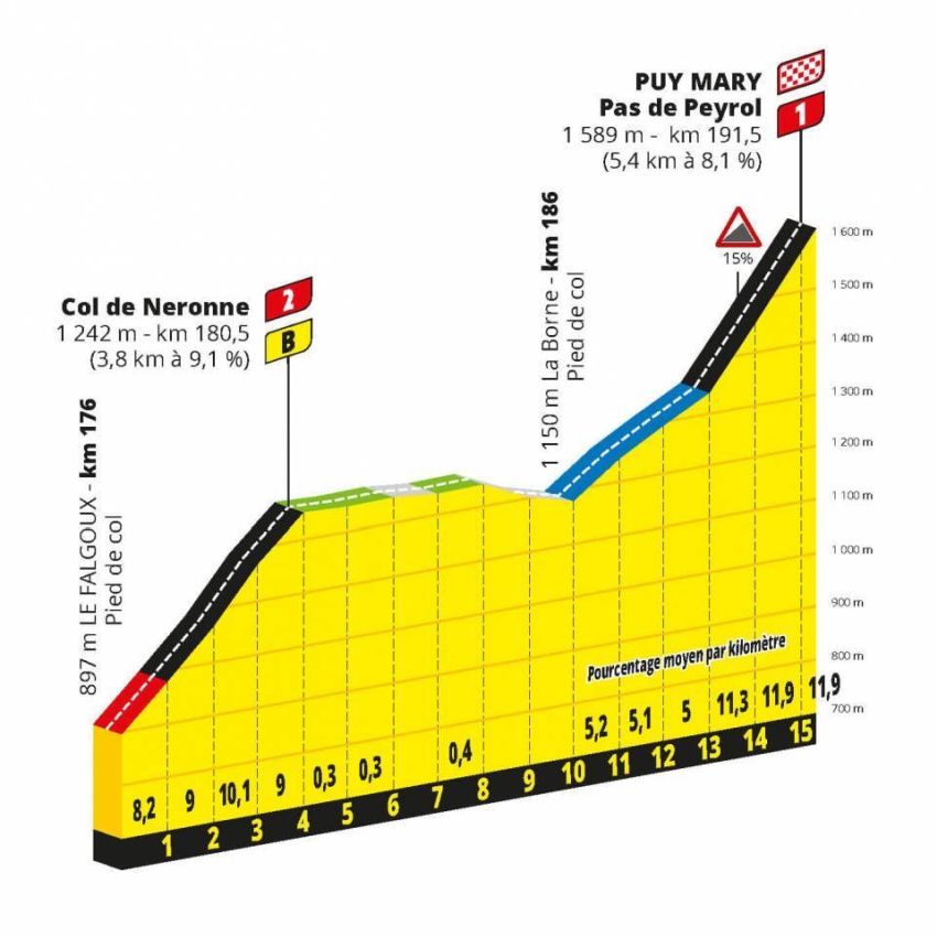 Neilson Powless, o primeiro ciclista nativo norte americano a disputar o Tour, foi ao ataque na subida de Côte d’Anglards-de-Salers, ante penúltima do dia. Foi o momento em que Max Schachmann da Bora juntou-se a Powless para as duas ultimas subidas do dia e 35km. Atrás na perseguição Marc Soler da Movistar tentava acelerar.