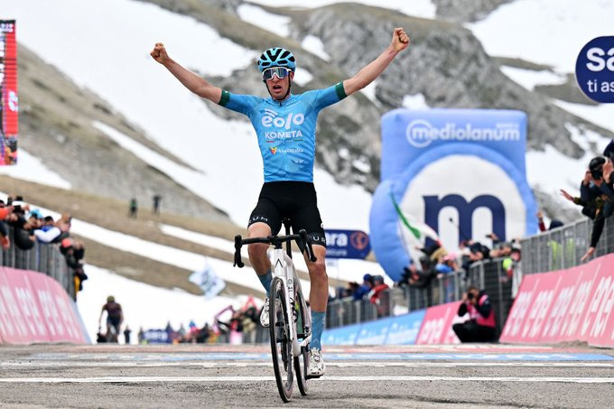 Dia da fuga no Giro tem vitória do italiano Davide Bais de 25 anos da equipe Eolo Kometa. Com as mãos unidas como se rezasse, Karel Vacek cruzou em segundo e Simone Petilli completou o pódio.