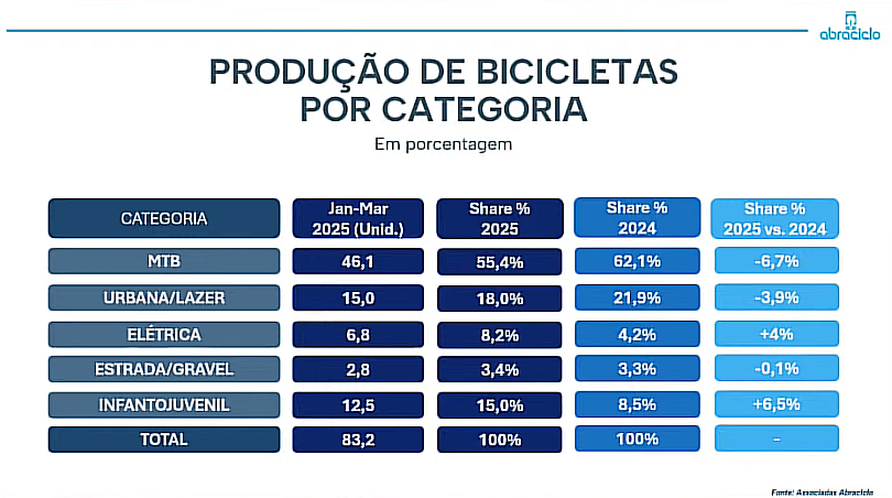 A tradicional liderança das mountain bikes na produção e venda permanece, embora tenha sofrido uma leve retração em relação ao trimestre anterior. Este recuo, porém, é compensado pelo crescimento de outros segmentos, principalmente as bicicletas infanto-juvenis, que saltaram para 15% de participação de mercado.