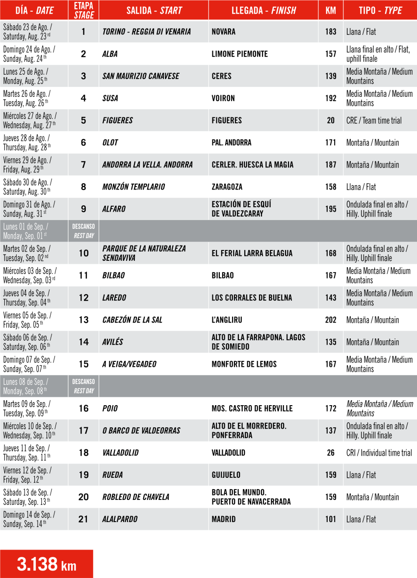 Ao todo serão 3180km pela que hoje é a 3a grande volta da temporada. Antes de entrar de fato nesta edição, voltamos no tempo para a época onde a Vuelta era disputada na primavera europeia, quase simultaneamente com o Giro d’Italia. Aliás esse é o grande motivo pelo qual no passado dificilmente um ciclista participava das três grandes voltas. A La Vuelta teve sua primeira edição em 1935, tendo surgido a partir do jornal Informaciones com o espanhol Juan Pujol. Apesar da aparente espanhola da 2a guerra, a Espanha passou por uma dura guerra civil, assim a La Vuelta voltou a ser disputada apenas em 1955. No hall da fama dos vencedores, nomes como Eddy Merckx, Raymond Poulidor, Alberto Contador, Chris Froome brilham e temos um destaque especial a Primoz Roglic que juntamente com Roberto Heras são os recordistas com quatro títulos cada.